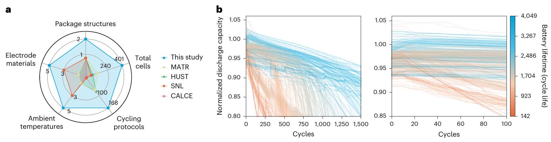 All datasets used in this study are publicly accessible and include MATR and CLO ( https://data.matr.io/1/ ), HUST ( https://data.mendeley.com/ datasets/nsc7hnsg4s/2), CALCE ( https://web.calce.umd.edu/batteries/ data) and RWTH ( https://publications.rwth-aachen.de/record/818642/ files). HNEI, SNL and UL-PUR datasets are hosted by BatteryArchive ( https://www.batteryarchive.org/study_summaries.html ). Moreover, we leverage an open-source tool, BatteryML ${ }^{35}$, to preprocess these datasets into a unified format to support experiments reported in this article.
