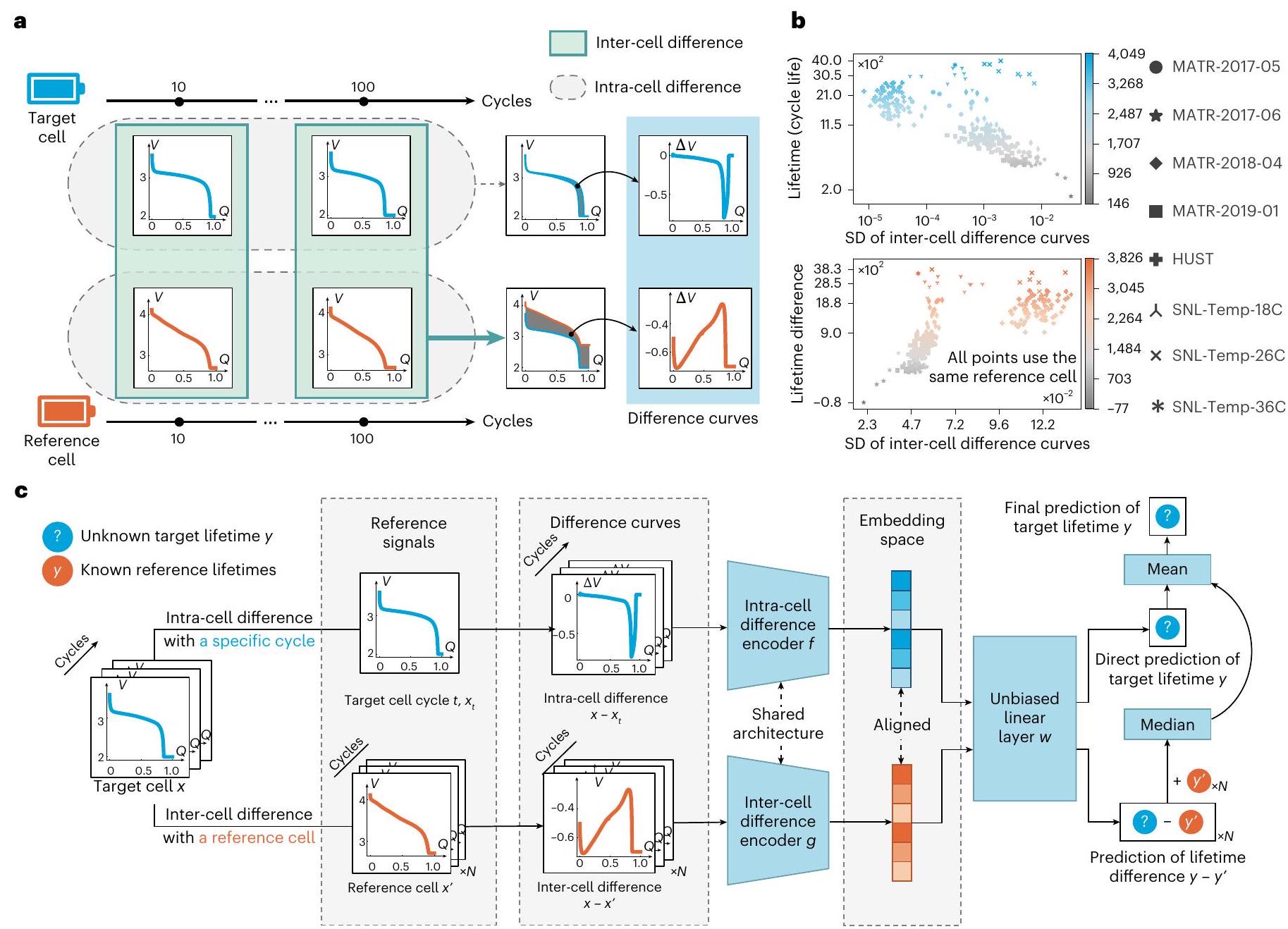 凭借高能量密度和低生产成本,锂离子电池已在现代工业中广泛应用,推动了可再生能源解决方案和电动汽车的发展 \(^{1-3}\)。然而,由于其固有的电化学机制,锂离子电池的容量在循环操作中不可避免地衰减 \(^{4}\)。意外的快速退化不仅会导致用户体验不佳(如电动汽车的续航焦虑),还可能影响关键设施(如电网稳定性)的运行。为了主动缓解这些副作用,准确预测电池在早期循环中的寿命已被确定为一项关键任务 \(^{5-8}\),其中寿命通常以循环寿命衡量,定义为电池容量降至其标称容量 \(80\%\) 时的充放电循环次数 \(^{9,10}\)。在早期循环中预测电池寿命极具挑战性,因为包括但不限于循环协议、环境温度和电极材料在内的众多因素共同影响着电池复杂的老化过程。此外,全面覆盖各种老化条件的成本和时间投入巨大,因为在特定条件下测试电池是一个漫长的过程。
