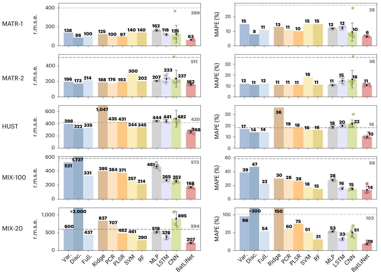 图3展示了BatLiNet与不同数据集上最先进基线的比较,采用均方根误差(r.m.s.e.)和平均绝对百分比误差(MAPE)两个指标。可以看出,依赖手工特征的基本线性模型,如'Var.'、'Dis.'和'Full'模型,在各自初始数据集上表现优异。然而,面对包含复杂老化条件的数据集时,其性能显著下降。这一趋势也体现在一些应用于原始容量-电压曲线的高级统计学习技术上,如岭回归、偏最小二乘回归、主成分回归和支持向量机。随机森林是个例外,即使在MIX-100和MIX-20数据集上也能持续提供相对稳健的预测。尽管如此,随机森林在所有评估数据集上的表现普遍欠佳。