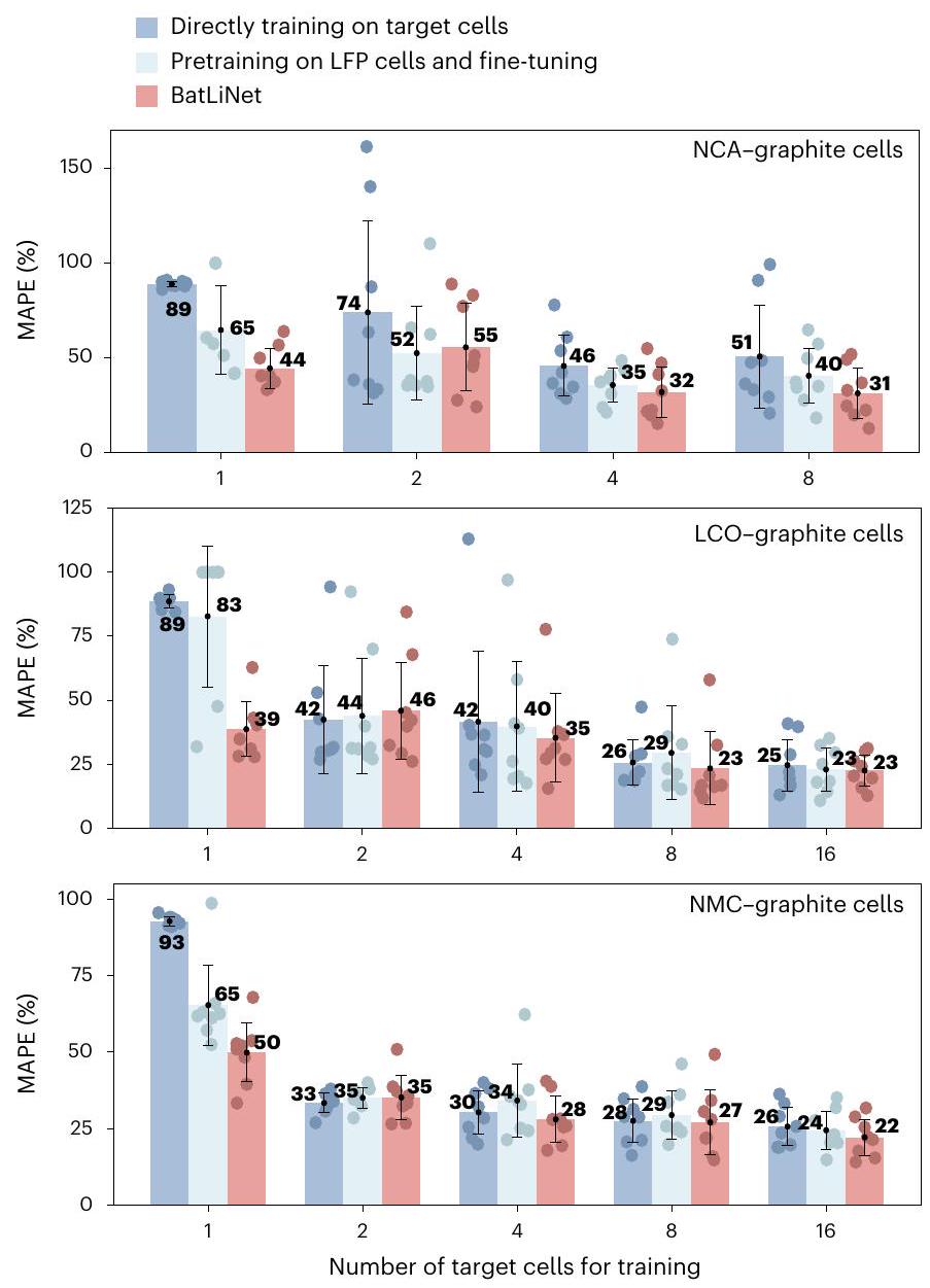 图4 | BatLiNet在从275个LFP电池转移到有限的NCA、LCO和NMC目标电池时的性能比较。我们通过改变可用于训练的目标电池数量(\(1,2,4,8,16\))来模拟各种低资源场景。BatLiNet的跨电池学习与两个基线进行了比较:直接在目标电池上训练的CNN模型和在LFP电池上预训练然后微调的CNN模型。每种情况和模型都经过八次独特的初始化和数据分割测试(\(n=8\)次试验),柱状图显示平均误差,误差条表示运行间的标准偏差。