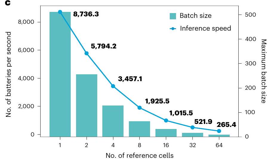 最后,我们解释了BatLiNet中的参考选择策略。图5展示了MIX-100数据集的扩展结果。图5a显示,为目标电池选择参考电池会显著影响预测误差,这一点从不同测试集电池的最佳与最差选择之间的差距可见一斑。虽然选择最优参考电池具有挑战性,但我们通过采样一批参考电池并使用它们的中位数预测来缓解性能波动,如图5b所示。图5c揭示,随着批量大小呈指数增长,这种批量采样机制确实会导致推理速度显著下降。然而,考虑到电池循环时间较长,这些推理速度上的差异可以忽略不计。我们发现,使用64个参考电池的批量能在保持合理推理速度的同时,提供稳健的预测。